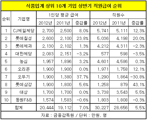 1위인 CJ제일제당의 평균 급여는 동원F&B에 비해 171.5%나 높았다.