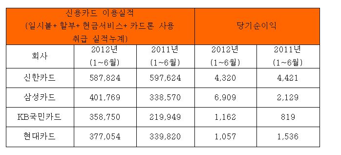 카드업계 관계자는 "소비자물가상승과 카드 사용 대상 확대 등으로 이용실적은 증가하고 있지만 가맹점 수수료 인하와 경쟁 과열에 따른 마케팅비 증가등으로 순익은 전반적으로 감소하고 있는 추세"라고 말했다.