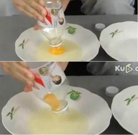 준비한 그릇에 계란을 깨 놓고 페트병 물을 버린다. 이 페트병을 약간 누른 뒤에 노른자에 대면 노른자가 페트병 속으로 빨려들어간다.