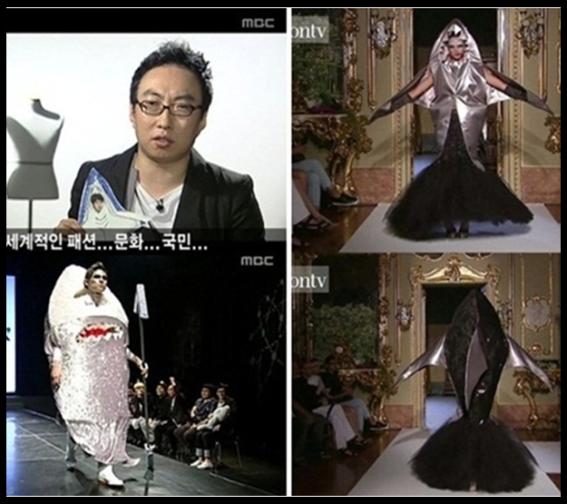 당시 이 상어 모양 디자인으로 박명수는 비웃음을 당했다. 그러나 3년 후인 지난 8월 알타로마 알타로타 패션위크에서 박명수의 옷과 비슷한 모양의 상어옷이 등장해 놀라움을 줬다. (사진-MBC, 온라인 커뮤니티)