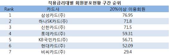 삼성카드의 경우 20%이상 고금리 이용회원 비율이 76.9%에 달했다. 10명중 8명가량이 고금리를 적용받고 있는 셈이다.
