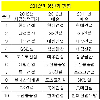 현대건설이 시공능력과 매출 모두 1위를 기록한 반면, 국토해양부가 발표한 2012년도 시공능력 평가에서 2위를 차지한 삼성물산은 매출순위에서는 4위로 밀려났고, 시공능력 3위인 대우건설은 매출 5위, 시공능력 5위인 포스코건설은 매출이 8위에 그쳤다.