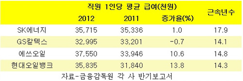 업계 1,2위인 SK에너지와 GS칼텍스는 상반기 직원 평균 급여가 제자리걸음을 한 반면, 에쓰오일과 현대오일뱅크는 수익악화에도 불구하고 두자릿수로 올리는 후한 인심을 보였다.