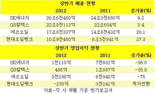 업계 1, 2위인 SK에너지와 SG칼텍스는 올상반기 매출이 9.2%, 3.4% 증가했지만 영업이익이 6천700억원, 1조원 이상 깎이며 비상이 걸린 상태다.