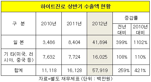 하이트진로는 올 상반기에 일본에서 418억9천400만원의 수출실적을 거둬 지난해 같은 기간의 84억400만원에 비해 400% 가까운 증가세를 보였다. 지난 2010년 34억8천600만원에 비하면 불과 2년 만에 수출액이 12배 넘게 불어났다.