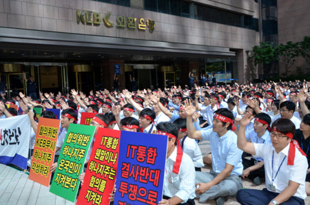 7일 금융권에 따르면 외환은행 노조는 지난 4일부터 4일째 은행본점 앞에서 하나금융의 IT 사전통합 규탄집회(하루 3회)를 열고 "하나금융이 IT 통합작업을 중단하지 않을 경우 '끝장투쟁'도 불사하겠다"며 강경 대응의지를 보이고 있다