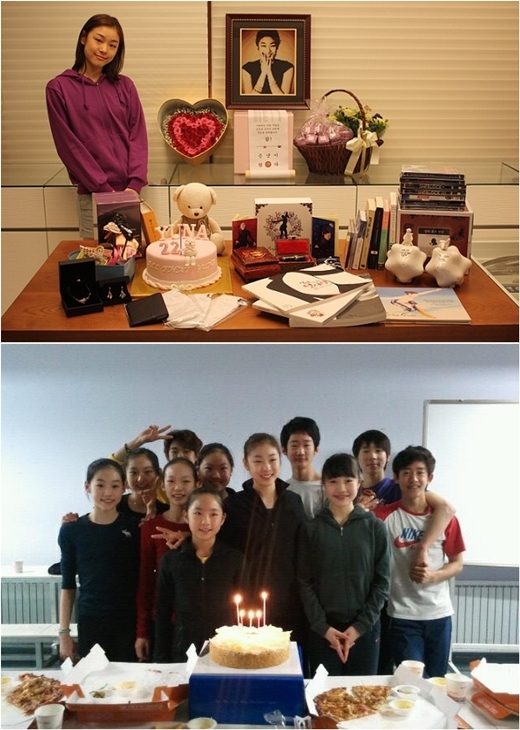공개된 김연아의 '생일 인증샷'은 생일 케이크와 꽃다발 등 선물들 앞에서 포즈를 취한 김연아의 사진과 후배 선수들과 함께 케이크에 불을 붙인 사진 총 두 장이다.