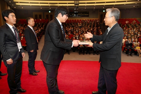 KT 이석채 회장이 7일 경기도 분당 KT 본사 사옥에서 열린 ‘2012년 KT 고객서비스직 입문교육 수료식’에 참석해 2012년 고졸 신입사원 317명에게 수료증을 수여하고 입사를 축하했다.