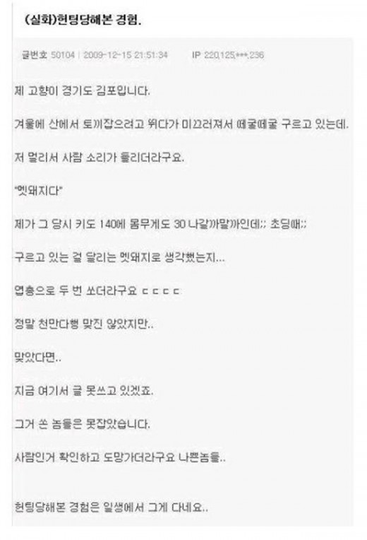 '헌팅 당해본 경험' 작성자는 겨울에 산에서 토끼 잡으려다 미끄러져 구르게 됐는데 멀리서 그 모습을 본 사냥꾼들은 작성자를 멧돼지로 착각하고 엽총을 쏘기 시작했다.