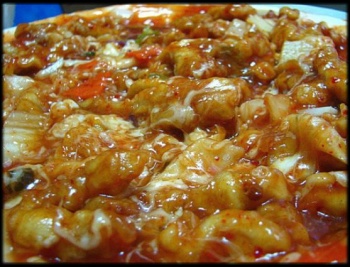 사진 속에는 피자와 흡사하지만 탕수육과 김치 등이 토핑돼 있는 '피탕'이라는 음식의 모습이 담겨있다.