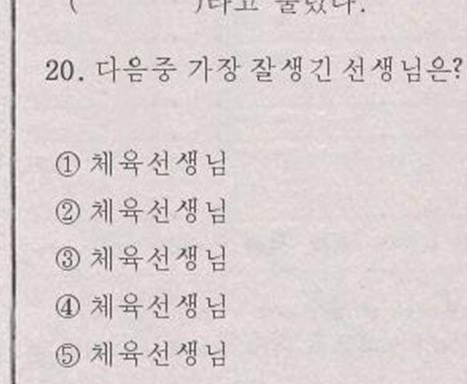 8일 온라인 커뮤니티 등에 따르면 5지 선다형 가장 잘 생긴 선생님을 묻는 질문에 1번부터 5번까지 모두 '체육선생님'만 선택할 수 있다. 잘 생 긴 선생님을 묻는 질문지에 답변이 모두 체육선생님으로 동일한 것.