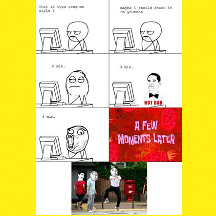 공개된 '강남스타일 중독 과정' 게시물에는 싸이의 '강남스타일' 뮤직비디오를 본 후 분단위 반응을 표현했다.