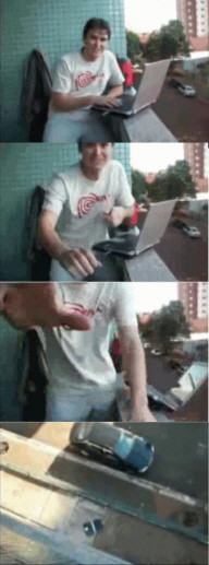 이 영상에는 한 남성이 동영상을 찍는 친구의 카메라를 빼앗으려 자리에 일어섰다가 창문 난간에 올려놓은 노트북을 건드려 바닥으로 떨어지는 장면이 담겨 있다.