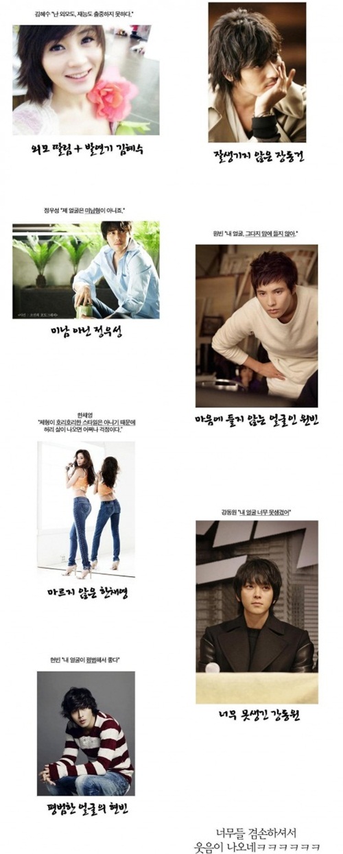장동건은 “나는 잘생기지 않았다” 라는 발언을, 원빈은 “내 얼굴 그다지 맘에 들지 않아”, 한채영“나는 마르지 않았다”라고 했다.