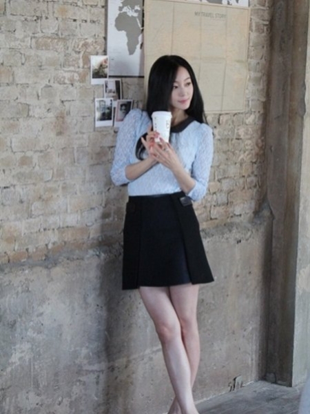 사진 속 한예슬은 검정색 미니스커트와 하늘색 긴팔 블라우스로 매치한 청순한 모습이다.