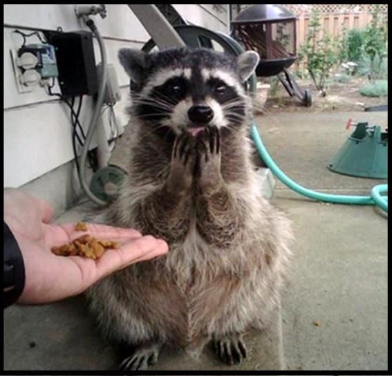 사진에는 너구리 한 마리가 사람이 주는 먹이에 두 발을 들어올리며 감동을 받은 듯한 모습이 담겨있다.