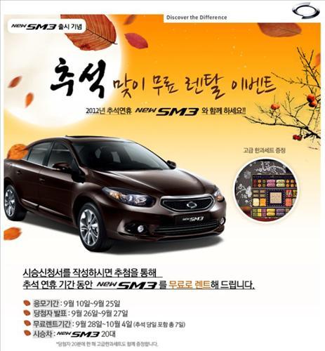 URL복사 기사공유하기 스크랩 프린트 메일보내기 글씨키우기 르노삼성자동차는 추석 연휴를 맞아 뉴 SM3 고객 체험 이벤트를 진행한다고 11일 밝혔다. 오는 25일까지 르노삼성 홈페이지(www.renaultsamsungM.com)나 영업지점을 방문해 신청서를 작성하면 된다. 추첨을 통해 20명에게 오는 28일부터 내달 4일까지 기름을 가득 채운 뉴 SM3 차량를 지원하고 한과세트도 함께 전달한다. 자세한 내용은 르노삼성 엔젤센터(☎080-300-3000)로 문의하면 된다. 저작권자 © 소비자가 만드는 신문 무단전재 및 재배포 금지 유성용 기자 다른기사 보기 URL복사 기사공유하기 주요기사 쿠팡 정보유출 사고로 피싱 시도 가능성 높아... 금융당국 '소비자경보' 발령 김동연 지사, 내년에도 다보스포럼 간다...3년 연속 공식 초청 받아 금호타이어, 폴란드 오폴레 지역에 첫 유럽 공장 짓는다...2028년 8월 가동 예정 국산차 11월 판매 3.9%↓, KGM만 웃었다...베스트셀링카는 ‘쏘렌토’ 김동연 지사, 기후보험 전국 확대 방안 논의..."대한민국의 뉴노멀로" 한신평, 키움·메리츠증권 등급 전망 '긍정적'으로 상향