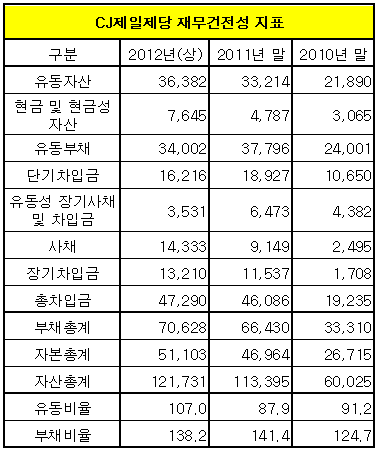 재무건전성을 보여주는 대표적인 수치인 부채비율은 올 상반기 138.2%로 2010년말 124.7% 보다는 높지만 지난해말 141.4% 보다는 개선됐다. 통상 부채비율은 100%이하를 표준으로 보지만 CJ제일제당 정도면 큰 문제가 없는 수준으로 평가된다.