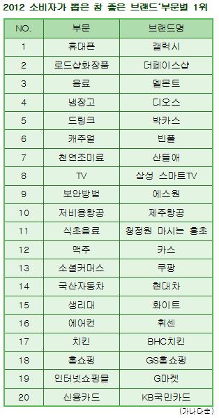 올해 단일 브랜드로 최고의 득표률을 기록한 브랜드는 삼성전자의 갤럭시(휴대폰) OB맥주의 카스 (맥주) LG전자의 디오스(냉장고) 제일모직의 빈폴 (캐주얼) 에스원 (보안방범) 등이었다.