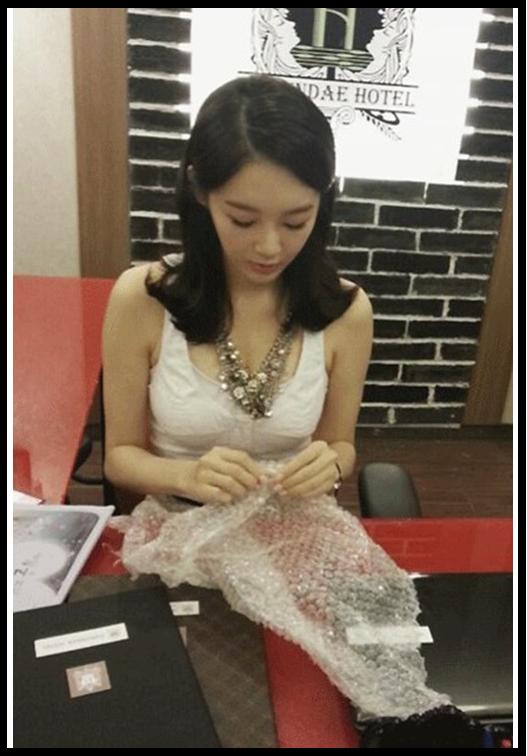 강민경은 에어캡 일명 '뽁뽁이'를 터뜨리며 진지한 표정이다.