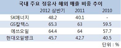 에쓰오일은 2010년 57.7%이던 해외 매출 비중이 올 상반기 64.4%로 6.7%포인트 상승했다. 같은 기간 GS칼텍스와 현대오일뱅크는 59.5%에서 65.3%로 40.5%에서 45.7%로 각각 5%포인트 이상 해외 매출 비중이 늘어났다.