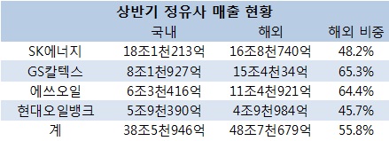 SK에너지는 34조9천950억원 중 16조8천700억원(48.2%)을 현대오일뱅크는 10조9천375억원 중 4조9천985억원(45.7%)의 매출을 해외에서 올렸다.