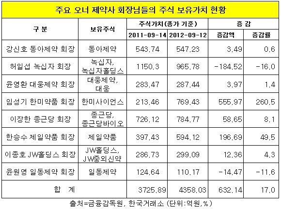 강신호 동아제약 회장과 윤영환 대웅제약 회장, 임성기 한미약품 회장 등 6명의 주식 평가액이 늘었고, 허일섭 녹십자 회장과 윤원영 일동제약 회장만 보유주식 평가액이 감소했다.