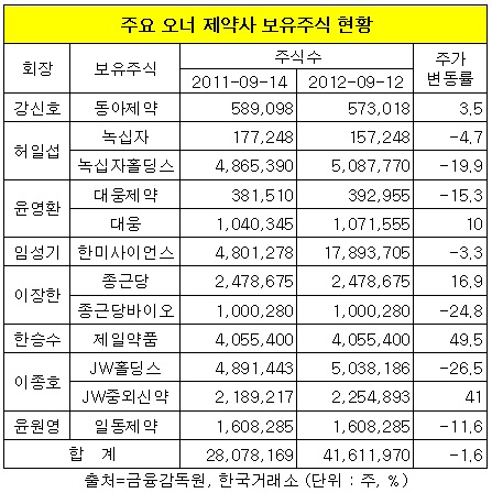 이는 제약사 오너 일가가 하락장세를 이용해 적극적으로 주식매수에 나섰기 때문이다. 이들이 보유한 관계 회사 주식수는 지난해 9월 2천810만주에서 올해 4천160만주로 1년 만에 1천350만주나 늘었다.
