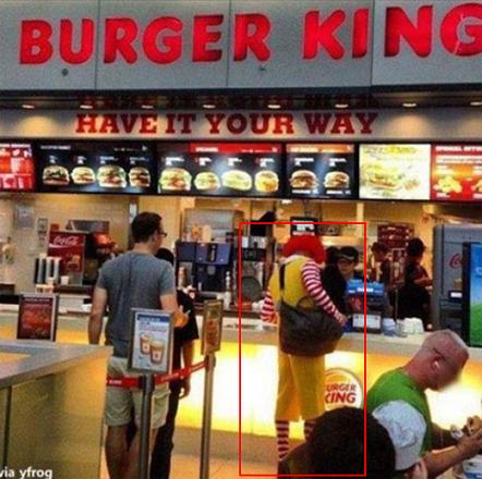공개된 사진에는 패스트푸드점 B사 카운터에 M사 마스코트 로날드가 가방을 멘 채 주문을 하고 있는 모습이 담겨 있다.