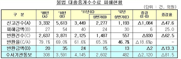 13일 금융감독원에 따르면 올해 상반기중 '불법 대출중개수수료 피해신고' 코너에 신고된 피해신고는 1천193건으로 전년 동기 대비 47.6%(1천84건) 감소했다. 금감원은 피해신고 중 557건, 총 13억원을 피해자에게 반환(반환율 46.7%)조치토록 했다.