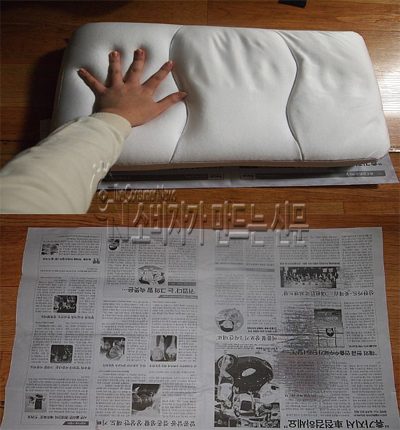 ▲ 3일간 건조에도 베개의 물기가 제거되지 않아 신문이 젖어 있다.