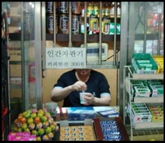 사진에는 버스 정류장의 한 상점에 '인간 자판기, 커피한잔 300원'이라는 문구가 적혀있다.