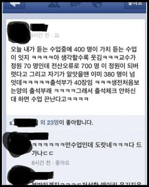 사연을 보면 친구가 보낸 문자에 “내가 듣는 수업 중에 400명이 같이 듣는 수업이 있지. 교수가 정원이 70명인데 전산오류로 700명이 정원이 돼버렸다고. 그리고 자기가 알았을 땐 이미 380명이 넘었대. 출석부가 40장임. 생전 처음 보는 양의 출석부래. 그래서 출석체크 안하신대. 하면 수업 끝난다고”라고 적혀 있어 웃음을 자아냈다.