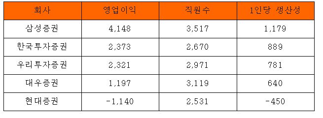 대우증권은 영업이익 199억7천만원에 1인당 생산성은 640만원을 기록해 4위에 그쳤다.