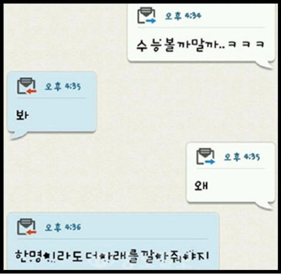 문자 내용을 보면 한 고3 학생이 "수능 볼까 말까"라고 고민을 하자 친구는 "봐"라고 답한다. 이에 친구가 왜냐고 묻자 "한 명이라도 더 아래를 깔아줘야지"라고 말해 웃음을 자아냈다.