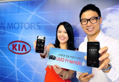 ‘UVO Friends’는 UVO 내비게이션이 장착된 차량에서 사용 가능한 UVO e서비스(텔레매틱스)와는 달리 차종에 상관 없이 누구나 이용 가능한 스마트폰 전용 차량-IT 서비스이다. 차량내 블루투스나 AUX 케이블로 연결 가능하다.