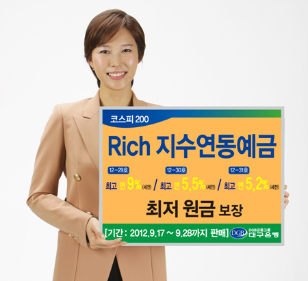 대구은행 관계자는 "지수연동예금은 원금을 보장하면서 주가 상승 시 추가 적인 수익을 추구할 수 있는 장점이 있어 요즘 같은 저금리 시대에 좋은 대 안 상품이 될 수 있다"고 말했다.