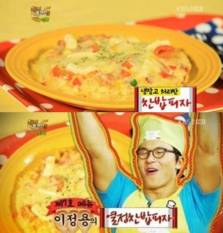 이정용은 "찬밥에 달걀을 반죽한 후 프라이팬에 버터를 두르고 두부, 토마토, 햄 등 기호에 맞는 재료들을 올린 후 케첩을 뿌리고 치즈를 넣으면 '찬밥 피자'가 완성된다"며 자신의 요리 레시피를 설명했다.