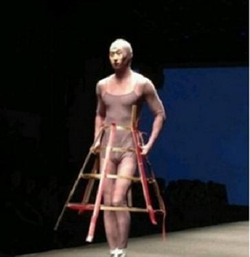 모델은 살색으로 된 전신 타이에 치마모양 프레임 구조물을 걸친 다소 난해한 패션을 선보이고 있다.