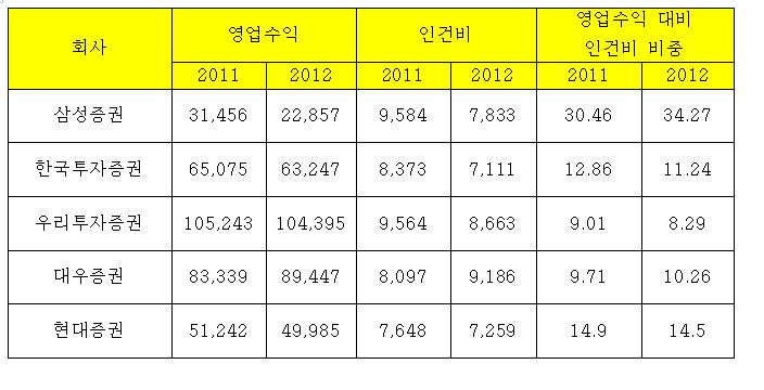 대우증권의 경우 5개 증권사 중 유일하게 영업수익이 늘었지만 인건비와 인건비율은 소폭 상승했다.