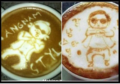 이 강남스타일 라떼아트는 '외국 커피 전문점에서 내놓은 커피 거품아트 중 싸이’라는 글과 함께 사진이 게재됐다.