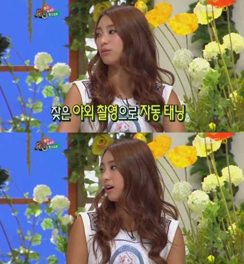 이날 보라는 건강한 피부비결에 대해 묻는 질문에 "원래 약간 까만데다 야외촬영을 많이 하다 보니까 더 까맣게 되더라"라고 말했다.
