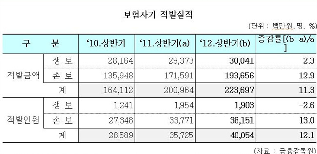 16일 금융감독원에 따르면 올 상반기 보험사기 적발금액은 2천237억원, 적발인원은 4만54명으로 전년동기 대비 금액기준 11.3%(227억원), 인원기준 12.1%(4,329명) 증가했다.