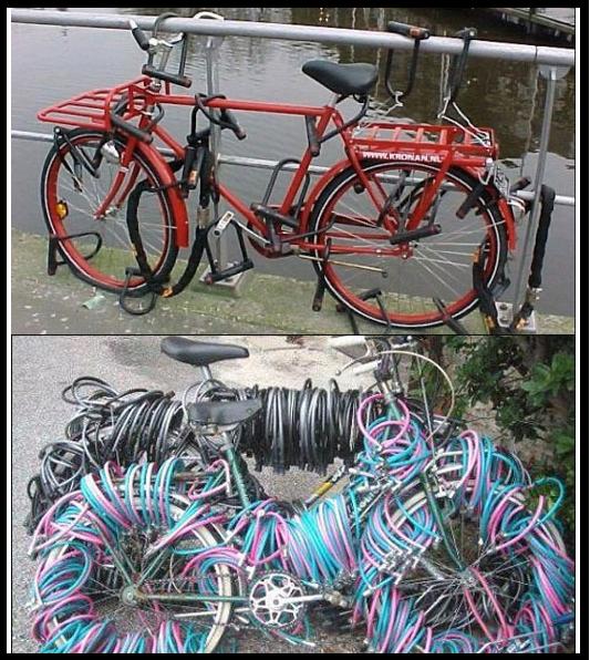 자전거를 도둑맞지 않기 위해 주인은 자전거에 수많은 자물쇠를 채워놓았지만 엄청난 시간과 노력이 들었을 듯하다.