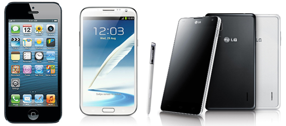 ▲ 좌측부터 애플 '아이폰5', 삼성전자 '갤럭시노트2', LG전자 '옵티머스G'