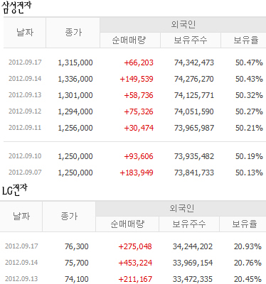 17일 LG전자는 전일 대비 0.79%(600원) 오른 7만6천300원에 장을 마감했다. 외국인들의 순매매는 아이폰5 공개일인 13일(국내시간)부터 계속해서 증가하고 있고, 이 기간 동안 외국인들의 지분율은 0.48% 포인트 상승 했다. 누적 순매매량은 93만9천439주에 이른다.