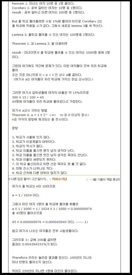 게시물에는 여학생이 드문 공대에 예쁜 여학생이 공대에 들어올 확률을 수학 공식으로 풀어놓았다.