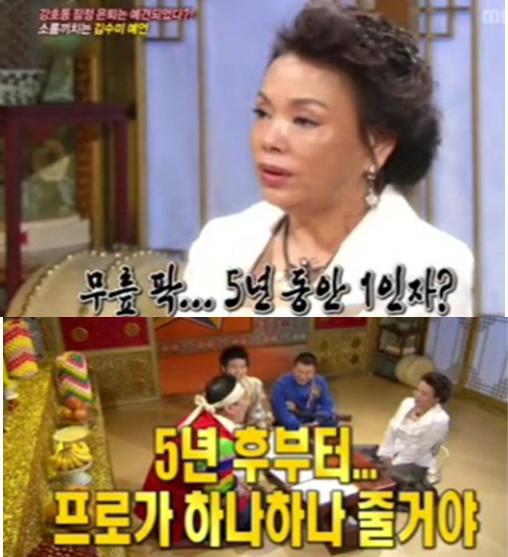 방송에서는 지난 2007년 김수미가 MBC '황금어장-무릎팍도사'에 출연해 강호동에게 “앞으로 5년 동안 1위 자리를 지키겠지만 5년이 지나면 조금씩 일이 줄어들 것”이라고 예언한 장면이 화제를 모았다.