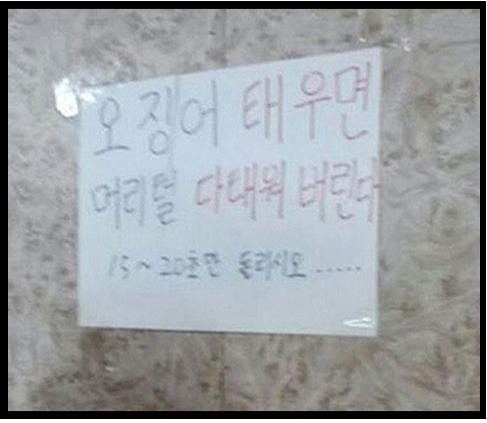 공개된 게시물에는 "오징어를 태우면 머리털 다 태워버린다. 15~20초만 돌리시오"라며 전자레인지 사용 설명이 담긴 경고문이 적혀있다.
