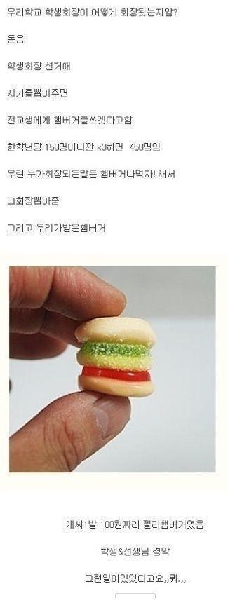이 글의 게시자는 "우리학교 학생 회장이 어떻게 회장 됐는지 아느냐. 선거 때 자기를 뽑아주면 전교생에게 햄버거를 쏘겠다고 했다. 한 학년 당 150명이니까 3 곱하면 450명이다. 우린 누가 회장되든 햄버거나 먹자해서 그 회장을 뽑았다. 그리고 우리가 받은 햄버거"라며 사진을 한 장 게재했다.